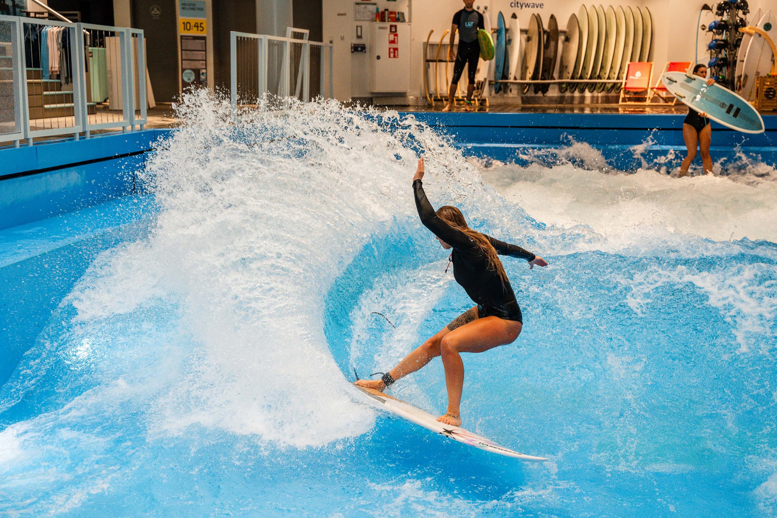 Hier surfst du mitten in der Stadt, im Untergeschoss des L&T-Sporthauses in Osnabrück. Die kraftvolle Citywave erzeugt eine bis zu 1,40 Meter hohe stehende Welle, deren Stärke individuell angepasst werden kann – ideal für deine persönliche Progression.