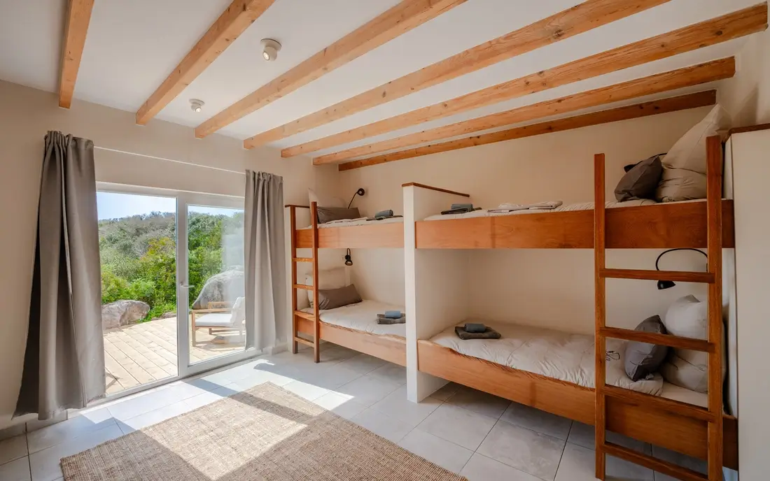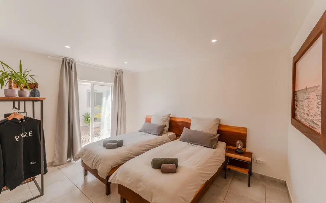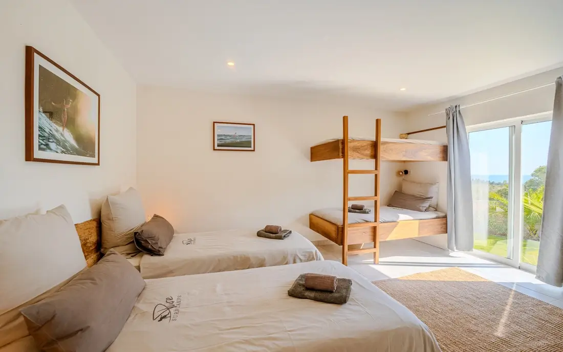 Großzügige Mehrbettzimmer in der Surflodge für Familien oder kleine Gruppen. Mit eigenem Bad, Balkon und direktem Zugang zum Garten.