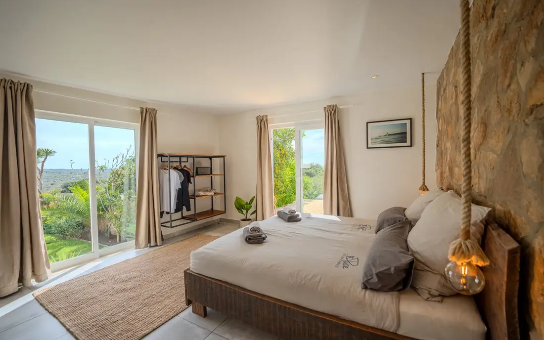 Moderne Doppelzimmer in der Surflodge mit eigenem Bad, Balkon und direktem Meerblick. Perfekt für Paare oder Freunde, die das lebhafte Camp-Leben genießen möchten.